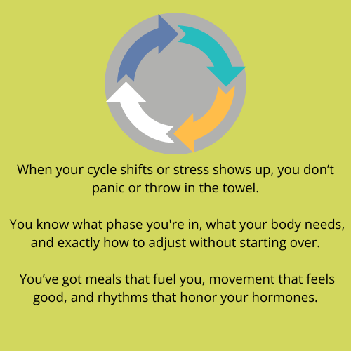 A hormone-smart approach that blends functional nutrition, sustainable movement, mindset coaching, and lifestyle rhythms tailored to your unique cycle.